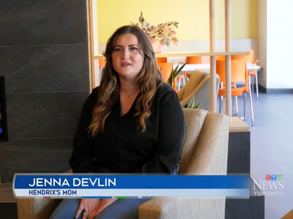 While caring for her son Hendrix during his hospital stay, Jenna Devlin found comfort in the Ronald McDonald House Toronto Family Room at SickKids in the Atrium. Today, she visits the new Family Room in the Patient Support Centre — a welcoming space offering the same support to more families in need.